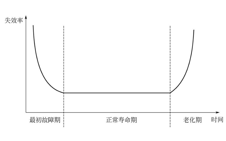 在可靠性理論中,“浴缸”(Bathtub)曲線是非常重要的對設備、模塊或元件的失效率在其整個壽命期內(nèi)變化情況的一種重要的描述,如圖1所示。